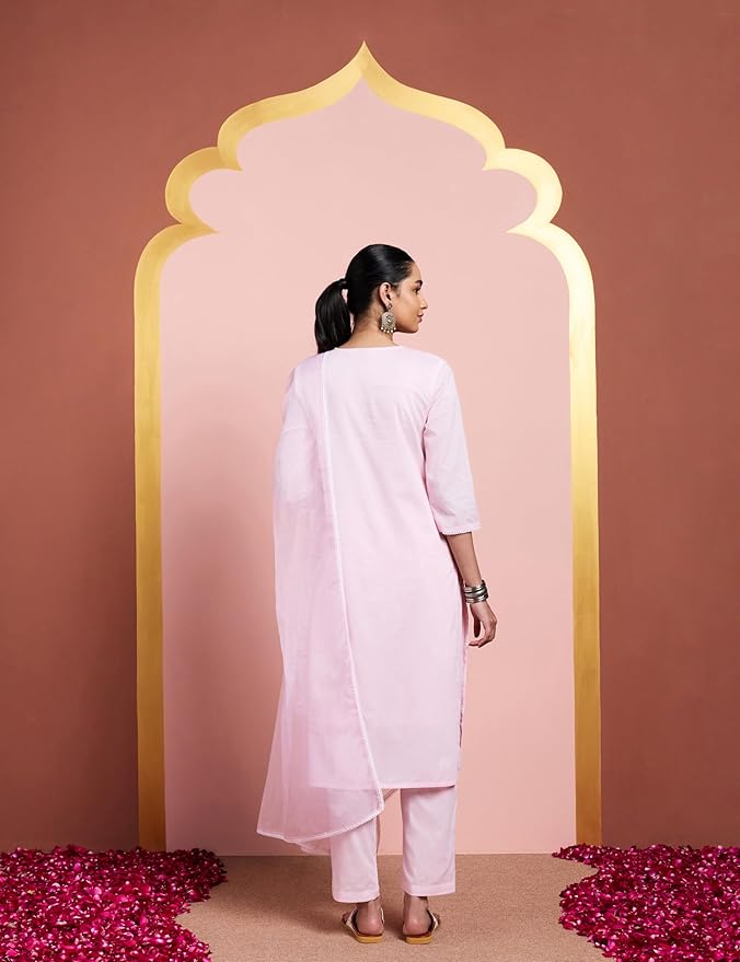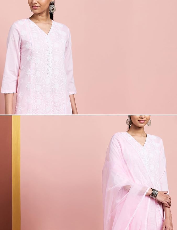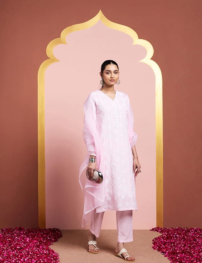 PRODUCT DETAILS: 3-piece set featuring V-Neck regular fit kurta with sequin embroidery at overall, 3/4th sleeves, paired with embroidered straight fit palazzo with side pocket and embroidered organza dupatta.