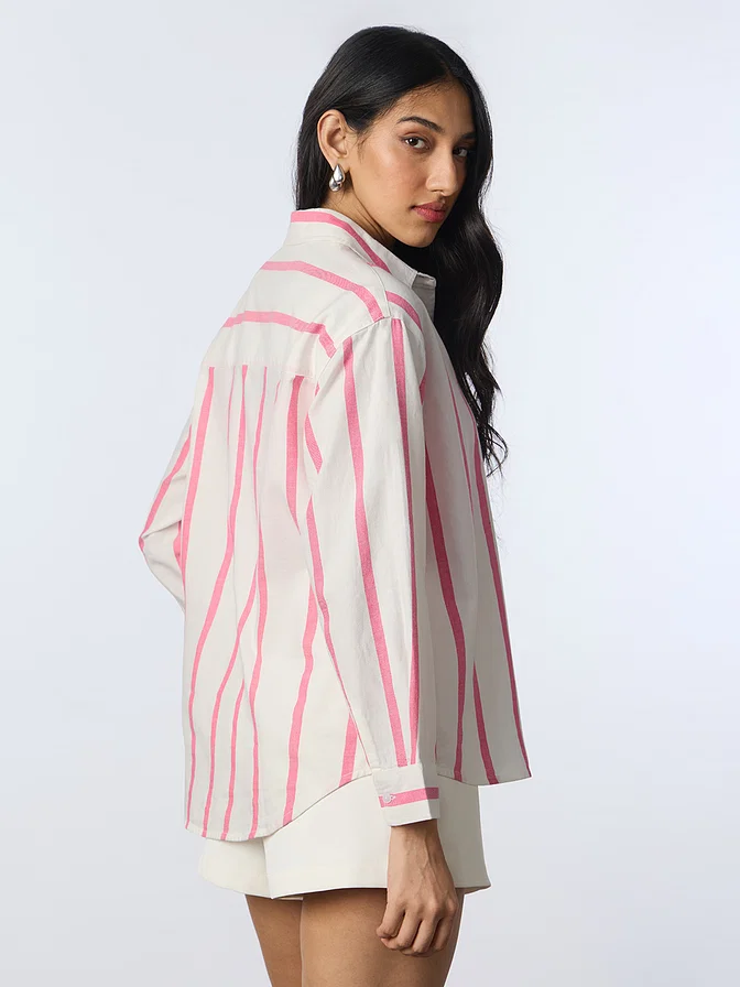 Chic meets charm in the Pink Stripes: Clover Bunny Boyfriend Shirt – a playful twist on timeless tailoring. This shirt effortlessly blends soft femininity with oversized street-style appeal. Crafted in a breathable, lightweight cotton blend, the shirt features a pastel pink striped pattern that’s accentuated with an adorable Clover Bunny print, bringing a whimsical vibe to your everyday look. The boyfriend fit drapes loosely over the body, giving it a relaxed, borrowed-from-him silhouette that offers comfort without compromising style. It’s designed with a full button-down front, dropped shoulders, long sleeves, and a classic collar – perfect for layering or wearing solo. Whether you're pairing it with denims for a casual day out, layering it over a bralette, or styling it with shorts for a breezy vacay look, this shirt is a versatile staple with personality. The soft hues and quirky detailing make it a must-have for those who like to dress with creativity and comfort at heart.